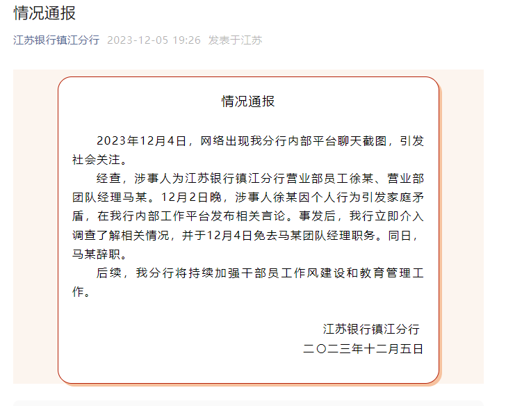 经查,涉事人为江苏银行镇江分行营业部员工徐某、营业部团队经理马某。12月2日晚,涉事人徐某因个人行为引发家庭矛盾,在我行内部工作平台发布相关言论。事发后,我行立即介入调查了解相关情况,并于12月4日免去马某团队经理职务。同日,马某辞职。