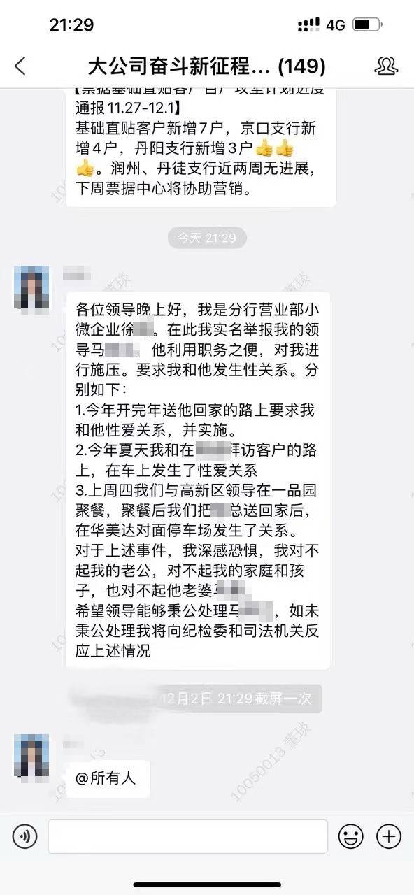 近日,网传一银行女性员工在工作群里实名举报,其称被一位领导施压多次发生性关系,网传信息称涉事银行是江苏银行镇江分行。12月5日晚,江苏银行镇江分行发布情况通报:
