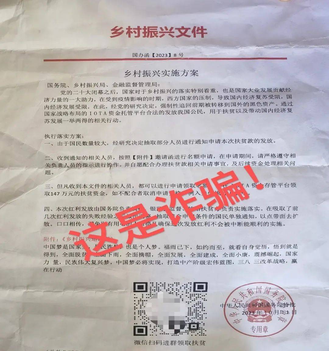 2、打着国家政策、国家支持的幌子,山寨机构、伪造文件,常人难以分辨,再以“投资少、回报高”的诈骗方案,通过微信朋友圈、微信群,进行拉人头式传销推广。