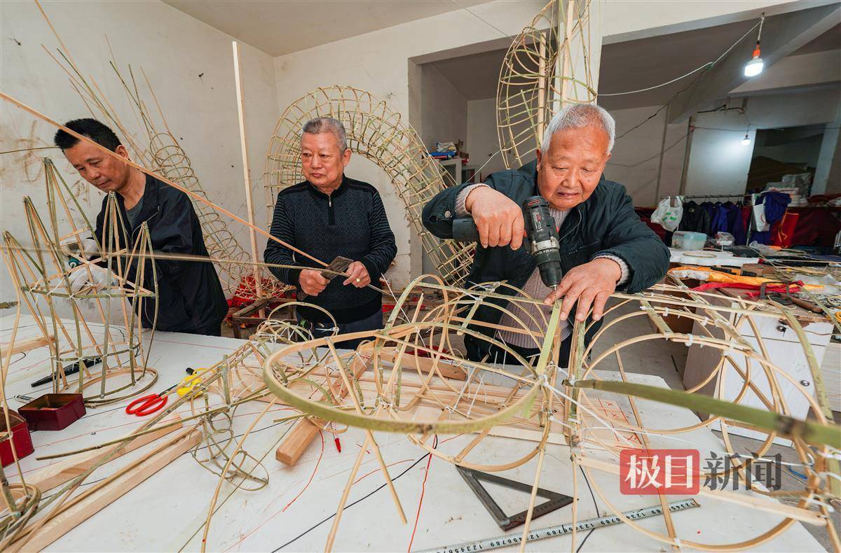 营造主理人刘吟山(右一)和他的队友廖益荣(中)、董化平(左)正在制作元宵长龙花灯
