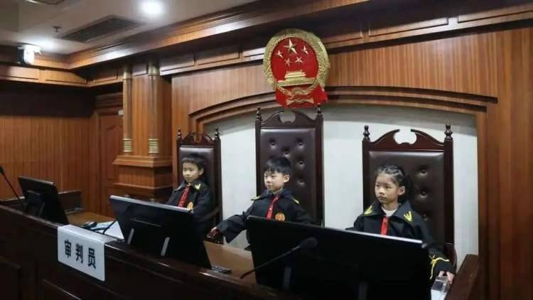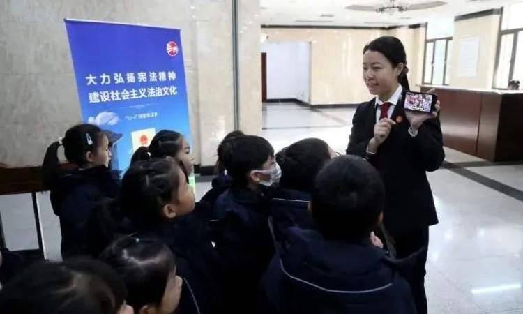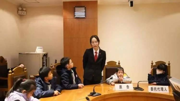 在扬波外国语小学老师的带领下,10余名学生来到静安区人民法院参加普法宣传教育活动,沉浸式体验法庭的神圣与威严。