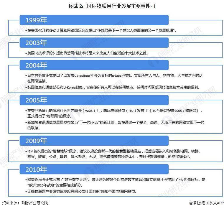 1999 年在美国召开的移动计算和网络国际会议提出," 传感网是下一个世纪人类面临的又一个发展机遇 ";2005 年,在突尼斯举行的信息社会世界峰会 ( WSIS ) 上,ITU 发布了《ITU 互联网报告 2005:物联网》,正式提出了 " 物联网 " 的概念 ;2009 年 IBM 提出 " 智慧地球 " 战略 ; 欧盟宣布 " 物联网行动计划 " 等等,物联网的发展在近两年开始加速。