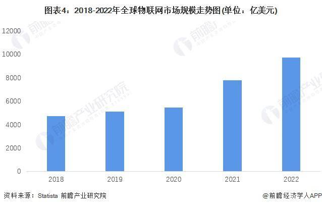 近年来,物联网技术得以不断积累与升级,产业链也逐渐完善和成熟,加之受基础设施建设、基础性行业转型和消费升级等周期性因素的驱动,处于不同发展水平的领域和行业交替式地不断推进物联网的发展,带动了全球物联网行业整体呈现爆发式增长态势。据 Statista 统计数据,2022 年全球物联网市场规模达到 9702.2 亿美元。