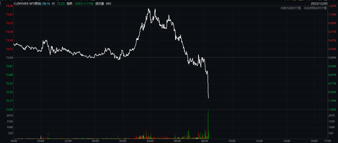 由于“欧佩克+”达成的减产协议力度不及市场预期,国际油价近日持续下挫,今日,国际油价盘中再现直线跳水,截至记者发稿,WTI原油报72.23美元/桶。