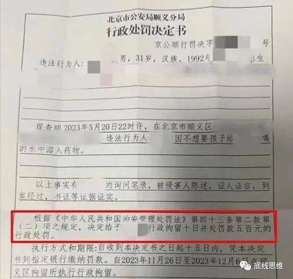 在报案一个多月后,11月30日,女子被医生男友暗中下堕胎药致流产一事终于有了结果。据当事人王女士称,该医生已被行政拘留10日,罚500元。