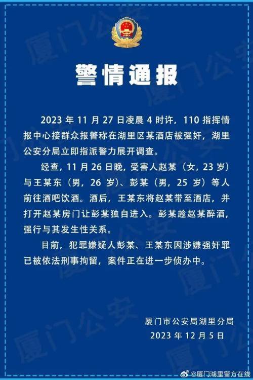 微博@厦门湖里警方在线 12月5日晚发布警情通报:2023年11月27日凌晨4时许,110指挥情报中心接群众报警称在湖里区某酒店被强奸,湖里公安分局立即指派警力展开调查。
