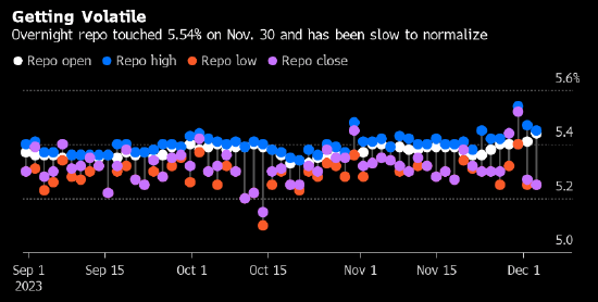 11月最后一个交易日短期利率大幅上升,隔夜一般抵押品回购利率飙升至5.50%以上。更为不寻常的是,即使进入12月,利率依然处于高位。