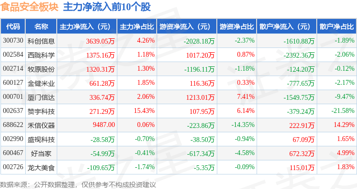 从资金流向上来看,当日食品安全板块主力资金净流出1.34亿元,游资资金净流入958.93万元,散户资金净流入1.25亿元。食品安全板块个股资金流向见下表: