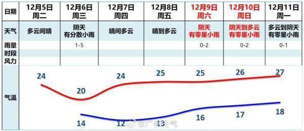 6日,清远、粤西、珠江三角洲中西部市县有小雨,其余市县多云,局部有小雨。最低气温:粤北市县12~15℃,南部市县17~21℃,其余市县15~17℃。