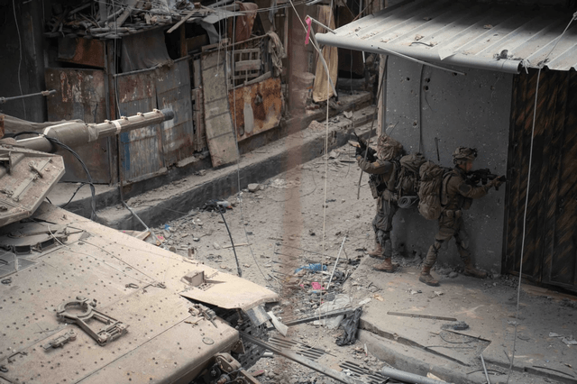 除此之外,传统意义上的巷战需要大量轻步兵深入城区街道,组织损失惨重的近距离对决。与此同时,以色列陆军主要是以大装甲兵团为主的编制体系,缺乏大量机动步兵,在不损失武装人员的基础上只能让士兵待在战车内,这就进一步降低了以军地面分队的观察能力,由于大量建筑物和废墟遮蔽了以军装甲单位的观察视角,造成以军在短时间内的感知盲区,哈马斯武装在城区防守中占尽优势。