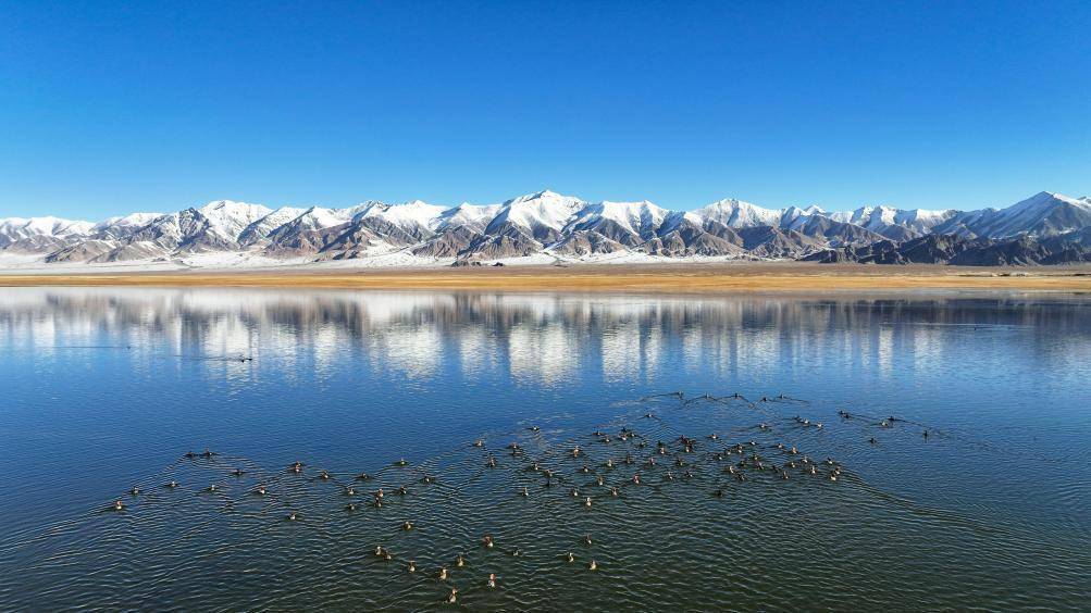 2023年10月18日,在新疆阿尔金山国家级自然保护区,针尾鸭等水鸟在依协克帕提湖栖息(无人机照片)。新华社记者 李响 摄