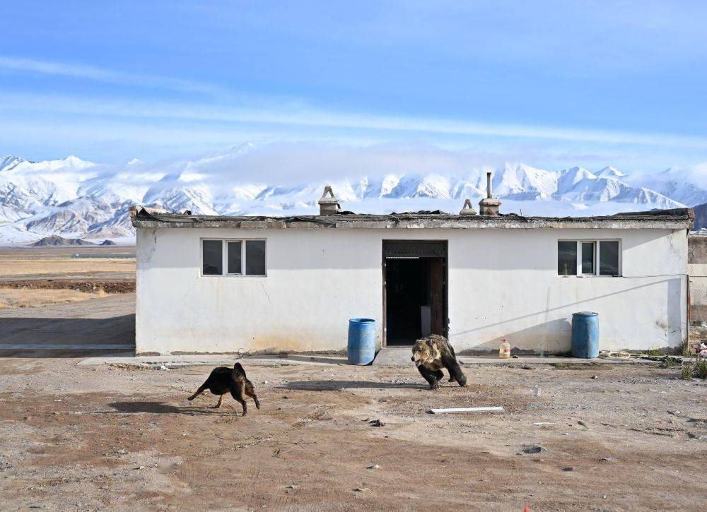 2023年10月17日,一只藏马熊(右)闯入新疆阿尔金山国家级自然保护区依协克帕提管护站。新华社记者 李响 摄