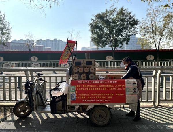 12月5日,郑东新区陈岗街与胡庄街交叉口,一辆挂着烤红薯招牌的电动三轮车迎着人流停在路边。窦俊艳正在翻着烤炉中的红薯,“卖红薯帮助同学女儿做骨髓移植”的红色牌子异常显眼。