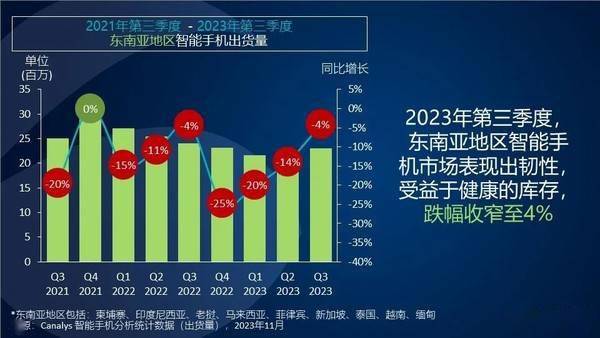 【手机中国新闻】12月6日,手机中国注意到,Canalys发布报告称,2023年第三季度,东南亚地区智能手机市场下滑4%至2300万部。Canalys分析师周乐轩(Le Xuan Chiew)表示,“通胀和高利率的环境,使得东南亚地区的智能手机市场已经连续7个季度下滑。经过前几个季度的挑战后,智能手机品牌在库存管理方面变得更为谨慎。虽然三星以19%的市场份额领跑市场,但仍在库存问题的影响下,经历26%的最大跌幅。