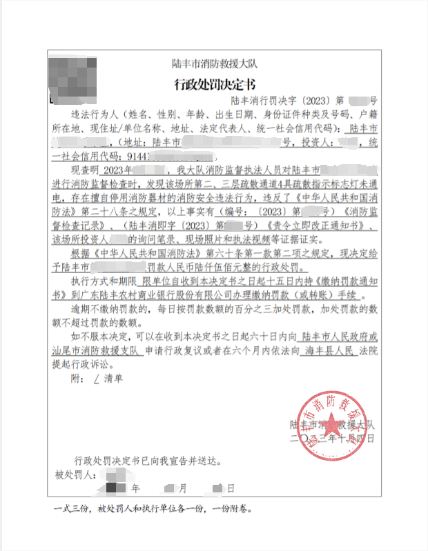 近日,陆丰市消防救援大队监督检查人员对陆丰市某音乐茶座开展消防监督检查时,发现该场所第二、三层疏散通道4具疏散指示标志灯未通电,存在擅自停用消防器材的消防安全违法行为,违反了《中华人民共和国消防法》第二十八条之规定,根据《中华人民共和国消防法》第六十条第二款之规定给予罚款。