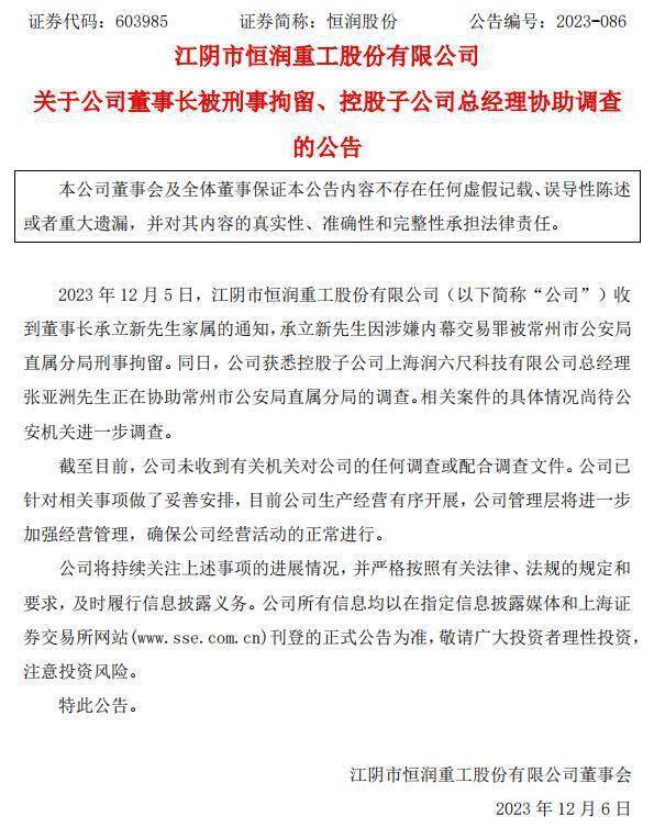 12月5日晚,位于江苏江阴市的上市公司恒润股份发布公告称,江阴市恒润重工股份有限公司收到董事长承某家属的通知,承某因涉嫌内幕交易罪被常州市公安局直属分局刑事拘留。