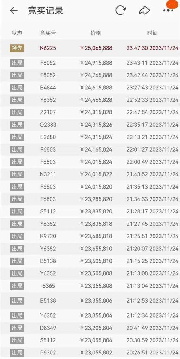 这一司法标的的竞价十分火热,近4万人围观,720人报名竞价,其中有人一次加价20万元竞拍,试图竞得这一靓号。