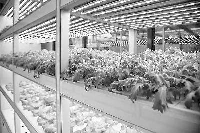 在日本、新加坡和美国等地已出现垂直农场,这是一种在多层建筑内进行食物周年连续生产的高效农业系统。它们可在从城市环境到戈壁沙漠的任何地方生产食物,在为无法开展传统农业的地区提供稳定食物供应方面具有显著优势。据报道,成都的垂直植物工厂利用一系列先进技术,包括采用自主培育的作物新品种、垂直立体栽培系统、营养液自动供给系统、基于人工智能的管控系统,实现了在垂直空间内的食物周年稳定生产。由于不受气候和地域影响,成都的设施在环境可控条件下能实现35天就收获一茬生菜(如图)。除了生菜以外,其他叶类菜、果菜、食用菌都可在此规模化生产。