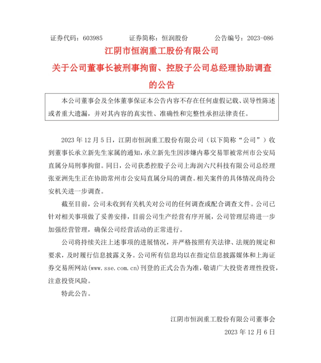 12月5日晚,“算力”牛股恒润股份公告称,公司收到董事长承某家属的通知,承某因涉嫌内幕交易罪被常州市公安局直属分局刑事拘留。