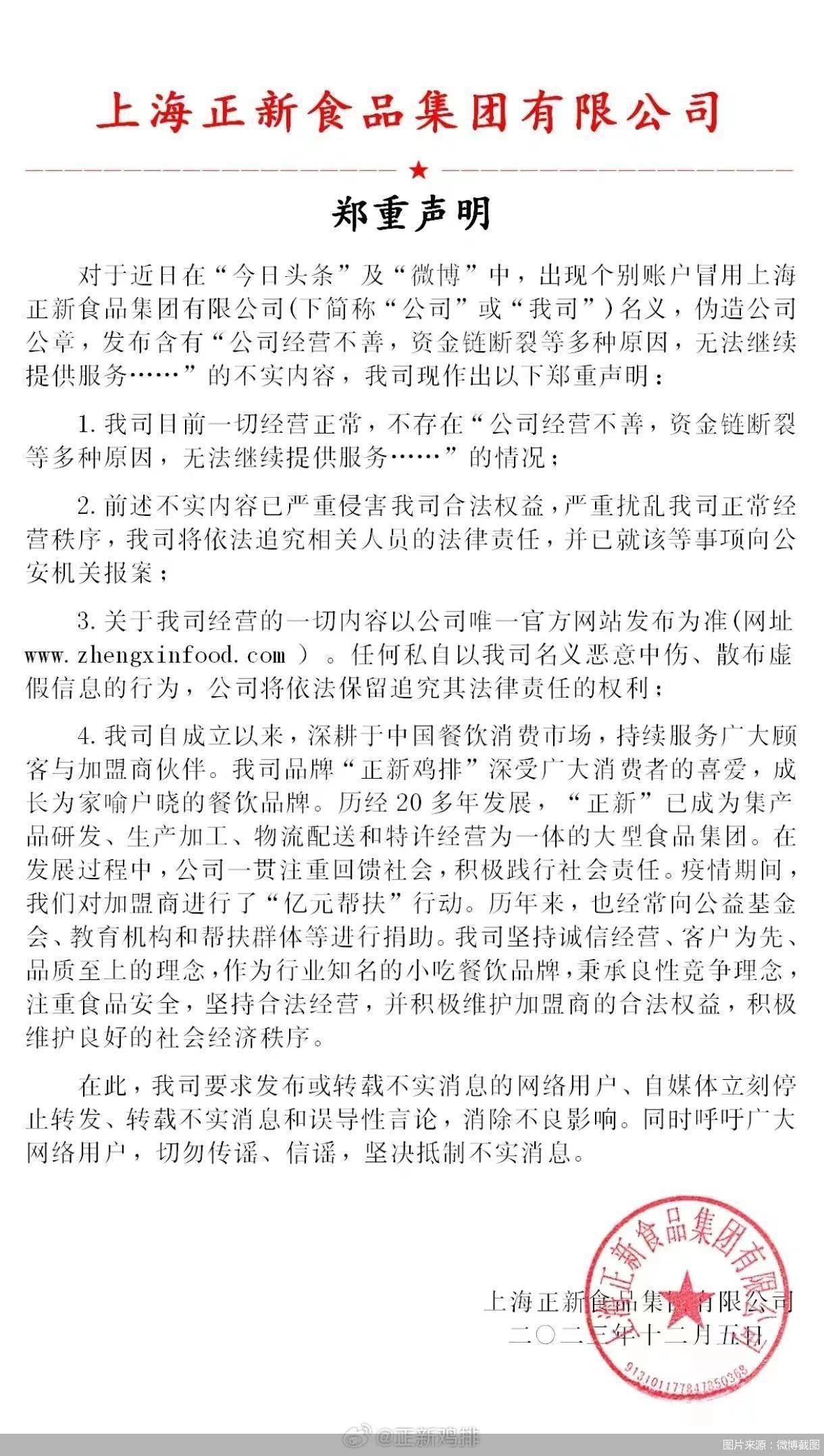 北京商报讯(记者 张天元)12月6日,正新鸡排通过社交平台发布声明。其中显示,近日在“今日头条”及“微博”中,出现个别账户冒用上海正新食品集团有限公司(下简称“公司”)名义,伪造公司公章,发布含有“公司经营不善,资金链断裂等多种原因,无法继续提供服务……”的不实内容,正新鸡排称公司目前一切经营正常,不存在“公司经营不善,资金链断裂等多种原因,无法继续提供服务……”的情况。
