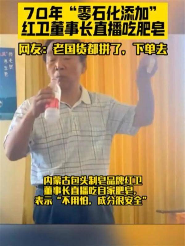 据今视频报道,内蒙古包头国产品牌红卫董事长9月19日在直播中,为了证明其生产的肥皂安全无添加,直接吃肥皂。