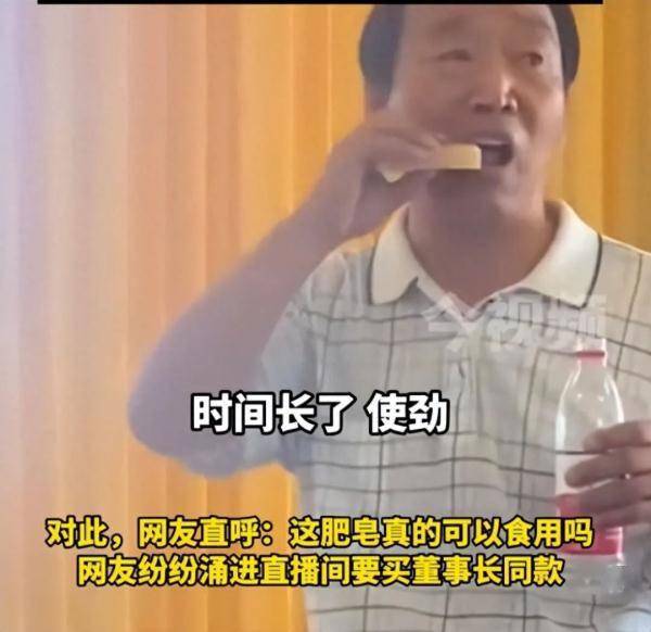 在直播中,红卫董事长一边说着:“里面没有任何有害的东西,你看。”然后拿起肥皂开始咬,“呀,这个干了咬不动。”随后对着肥皂又咬了一口,然后就着矿泉水喝下。