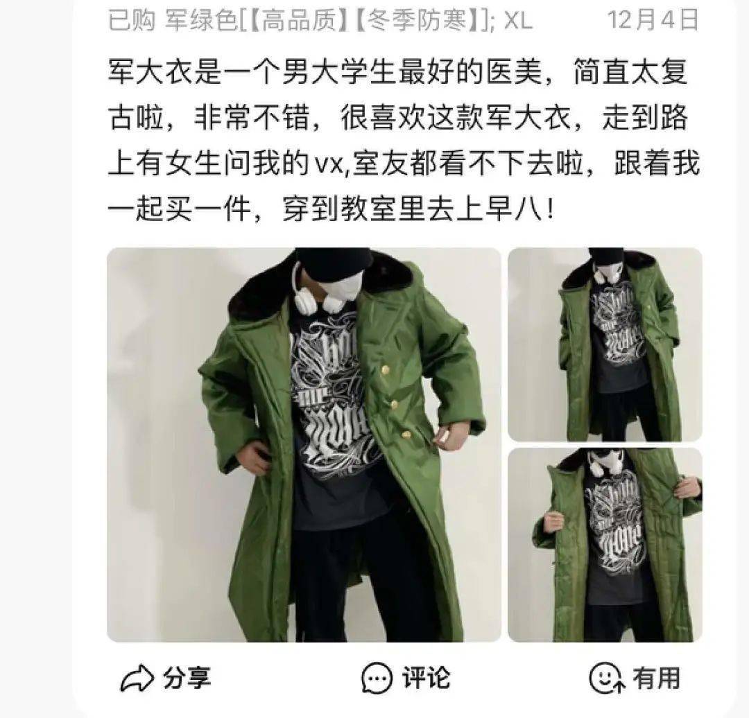 在购物软件上搜「军大衣」,下面一串大学生们都在排队好评。