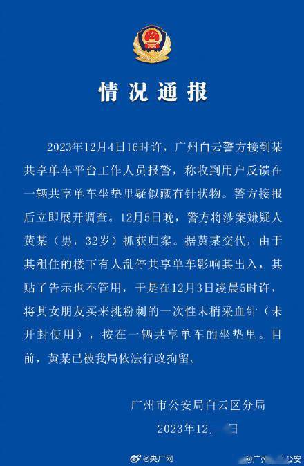 12月6日,广州市公安局白云区分局发布情况通报:2023年12月4日16时许,广州白云警方接到某共享单车平台工作人员报警,称收到用户反馈在一辆共享单车坐垫里疑似藏有针状物。警方接报后立即展开调查。12月5日晚,警方将涉案嫌疑人黄某(男,32岁)抓获归案。据黄某交代,由于其租住的楼下有人乱停共享单车影响其出入,其贴了告示也不管用,于是在12月3日凌晨5时许将其女朋友买来挑粉刺的一次性末梢采血针(未开封使用),按在一辆共享单车的坐垫里。目前,黄某已被我局依法行政拘留。