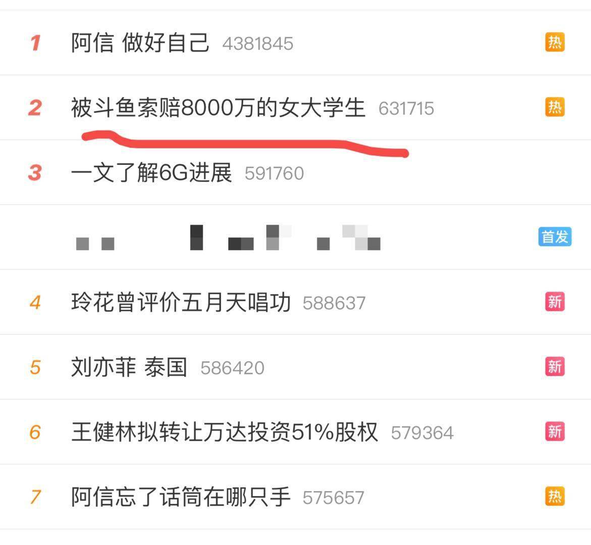 原标题:“被斗鱼索赔8000万的女大学生”登微博热搜