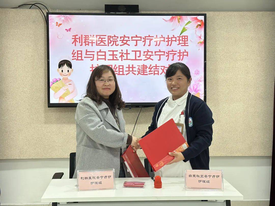现场,白玉社卫党支部与利群医院党总支签订“党建+业务”共建协议,依托区域医联体建立的绿色转诊通道;白玉社卫中心安宁疗护护理组与利群医院安宁疗护护理组签订共建结对协议,进一步打通资源互助共享通道,为医护创造更多互相学习和交流的机会,从而达到互相促进、共同提高安宁疗护护理的质量和效率,促进安宁疗护护理的持续改进和发展,提升患者在安宁疗护过程中的舒适度和满意度,提高终末期疾病患者的生活质量。