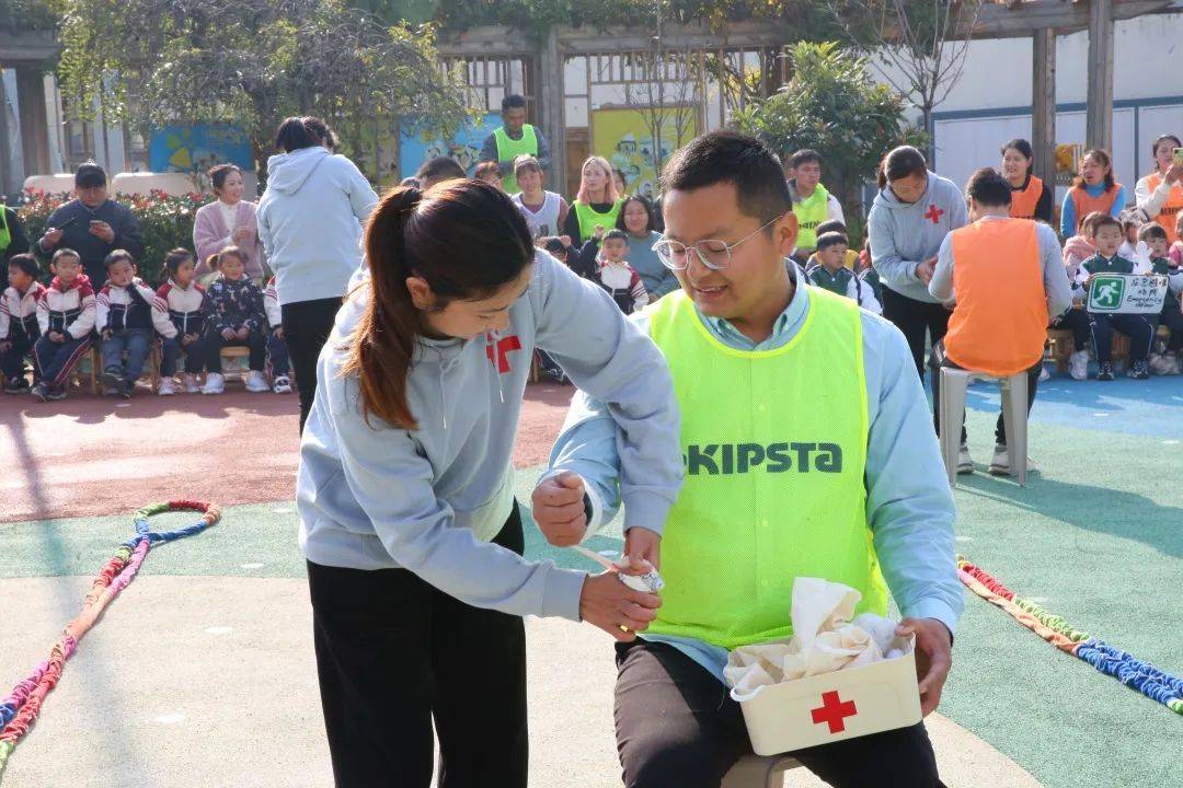 活动中,志愿者在地上摆放着代表着火位置的彩绳,手上则拿着象征燃烧火焰的彩色飘带,消防员和家长急救队的爸爸们要尽力避开这些“火焰”,将孩子们“解救”出来。游戏过后,爸爸们还充当“伤员”,由华亭镇红十字救援队进行包扎技巧展示,让孩子们全方位感受救援场景。
