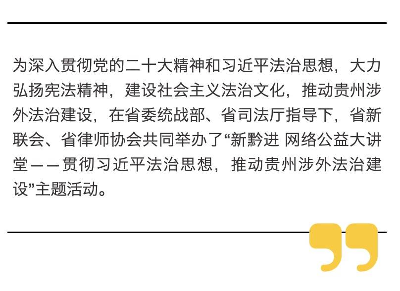 12月4日是第十个国家宪法日,为深入贯彻党的二十大精神和习近平法治思想,大力弘扬宪法精神,建设社会主义法治文化,推动贵州涉外法治建设,在省委统战部、省司法厅指导下,省新联会、省律师协会共同举办了此次主题活动。
