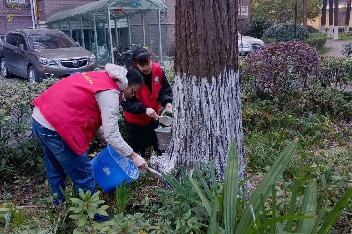 社区以新时代文明实践站为阵地,凝聚武汉科技大学国际学院的留学生志愿者团队力量,对小区的行道树、花坛绿化树进行了树干刷白,为树木穿上“白色战衣”,给绿植保暖、防治病虫害的同时,也为小区增添了一道美丽风景,进一步传递文明新风尚。