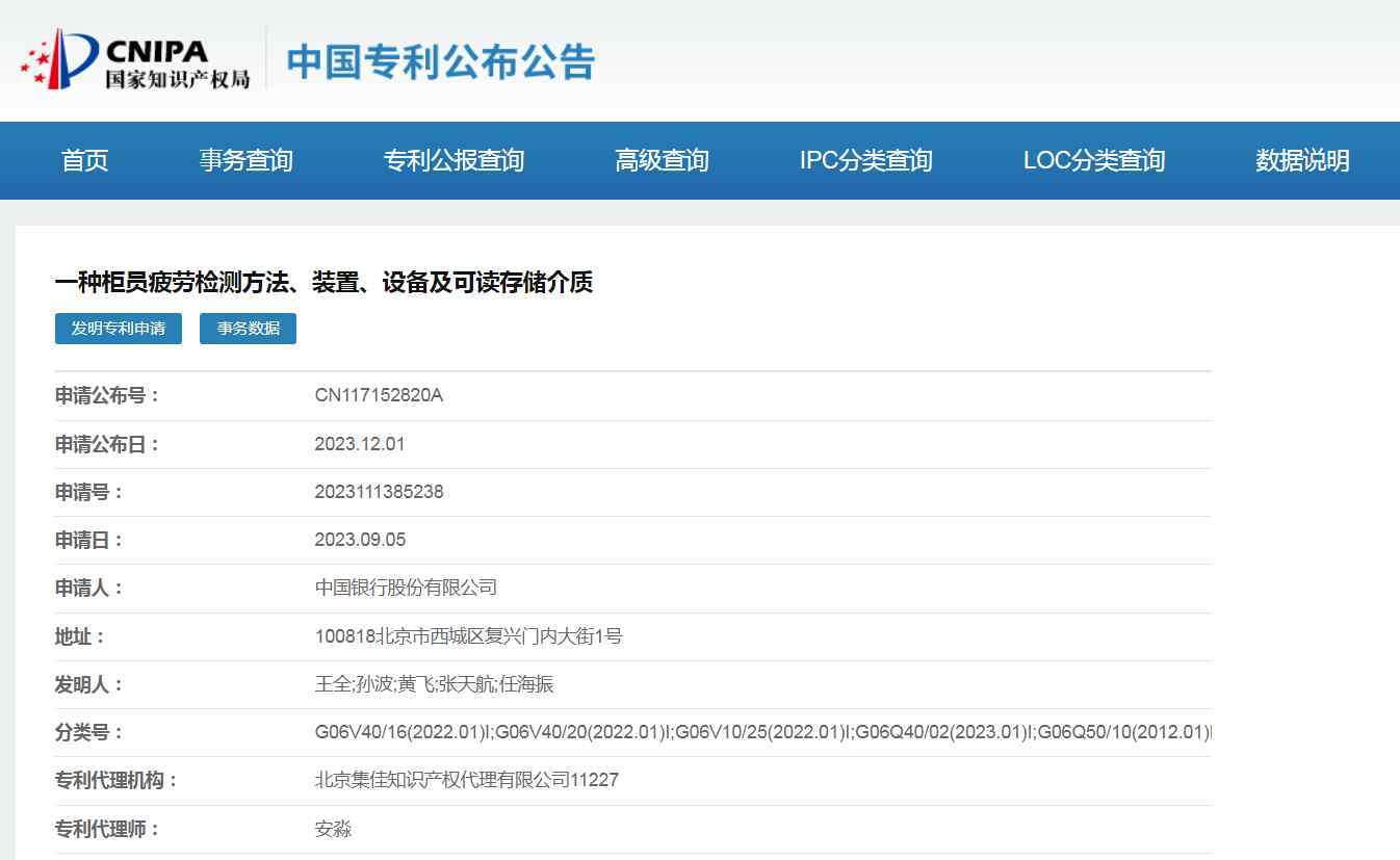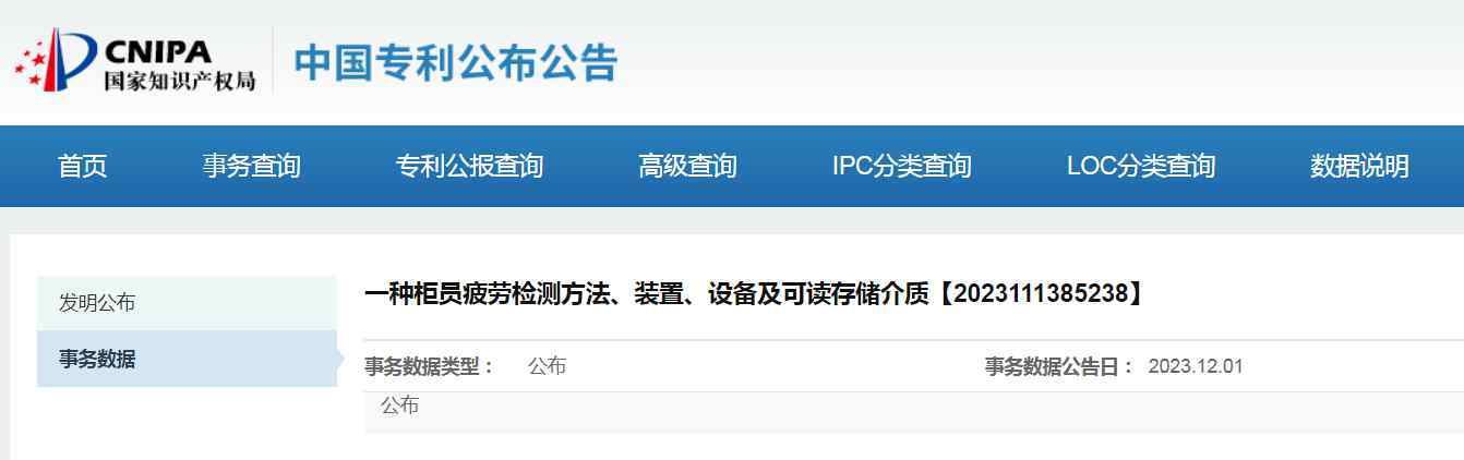 中新经纬12月6日电 (魏薇 实习生 张柳)据国家知识产权局中国专利公布公告网,中国银行股份有限公司(下称中国银行)近日申请一项发明专利,名为“一种柜员疲劳检测方法、装置、设备及可读存储介质”,该发明专利申请日为2023年9月5日,申请公布日为2023年12月1日,申请人为中国银行。页面显示,目前其事务数据类型为“公布”。