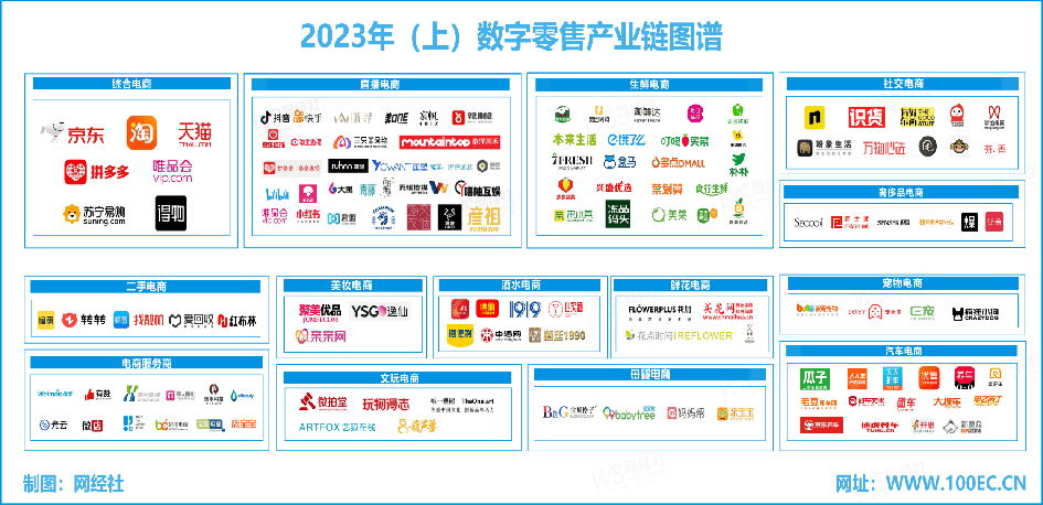 (1)综合电商:京东、淘宝、天猫、拼多多、苏宁易购、唯品会、得物等;