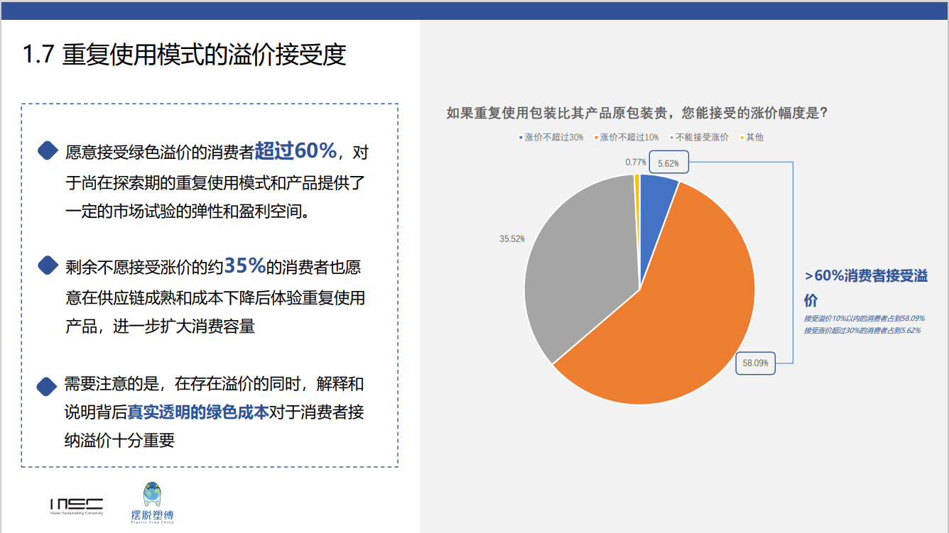 调研数据显示,能够接受重复使用绿色溢价的人群接近60%,其中包括能够接受溢价程度 10%的、超过 30%的两个不同档位的消费者。能够接受 10%溢价的消费者占大多数, 能接受 30% 溢价比例的消费者仅占5% 的比例。总计超过 60% 的绿色溢价支付意愿,已经代表了一个比较好的市场试验的弹性和盈利的空间。