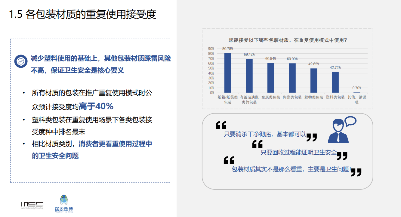 报告还发现,相比之下消费者更关注的并非材质类型,而是材质使用过程中是否足够安全和卫生。在设计和制作可重用包装的过程中,除了要在材料的选取上多做努力,也要关注消杀过程中的相关的卫生安全问题。