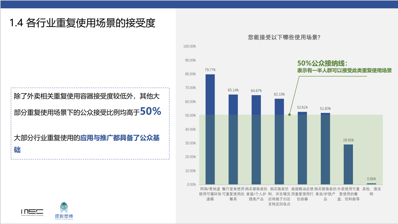 报告对各行业的重复使用场景和包装材料的类型的接受度进行了数据统计,发现除食品相关的重复使用容器的公众接受度相对较低外,其他场景下的重复使用模式都已经具备很好的公众推广基础,接纳度均达到50%。
