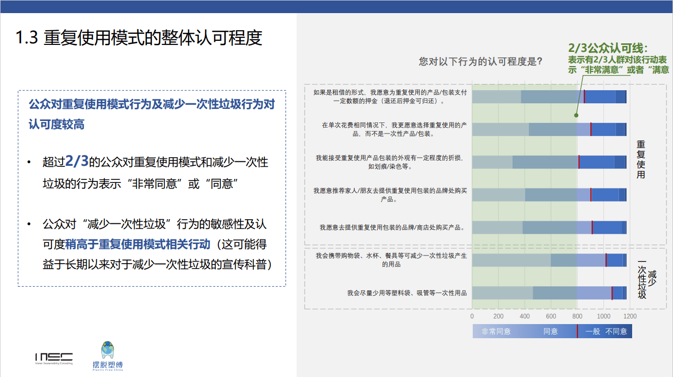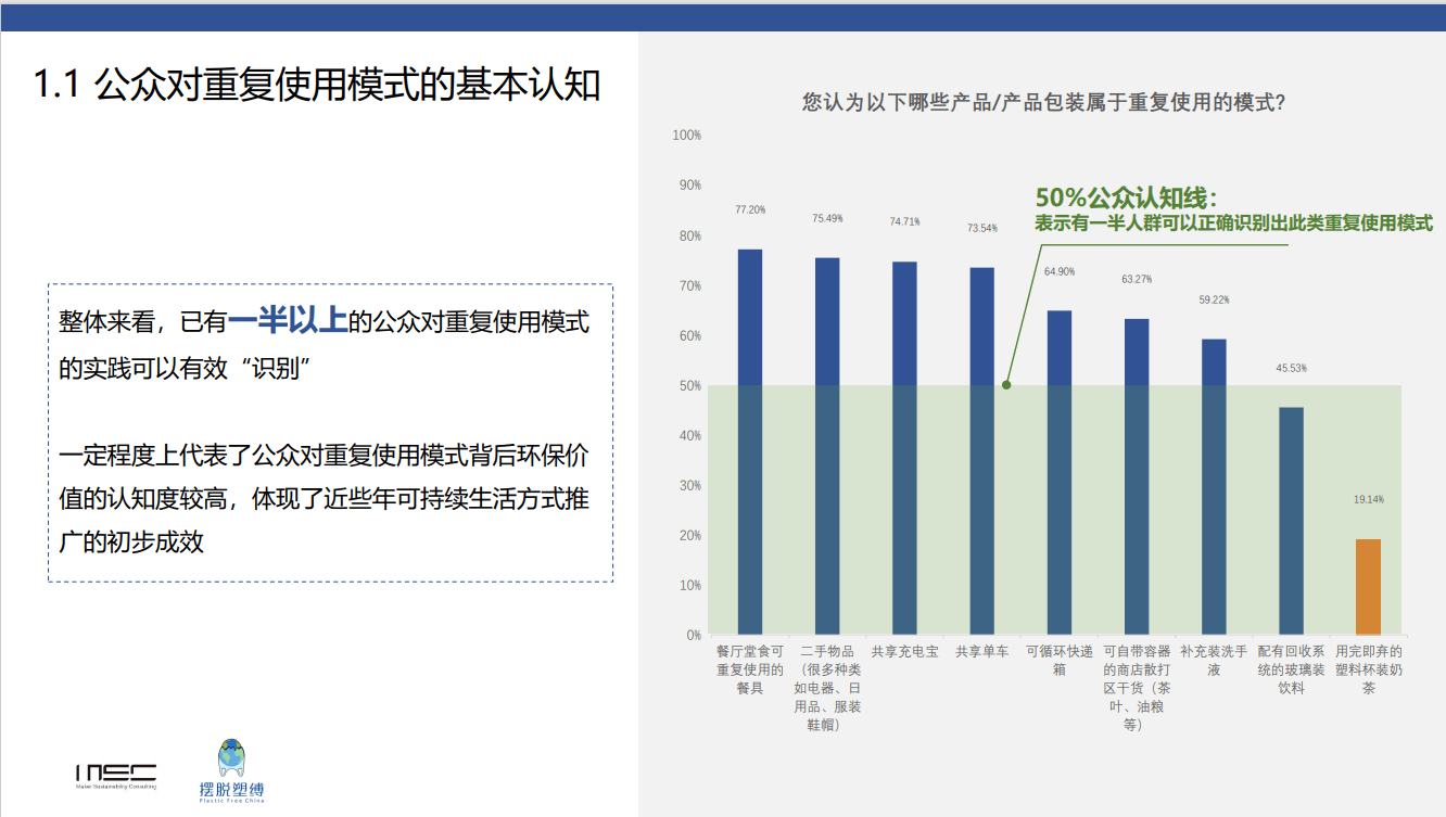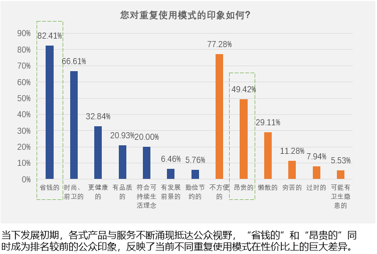 调研结果显示,消费者对重复使用的正面印象较多,报告认为这奠定了整个重复使用模式得以继续推广的良性发展基础。报告选取了具体的场景和模式,发现超过 2/ 3 的公众对重复使用的相关模式都表示了认同或者是非常认同。