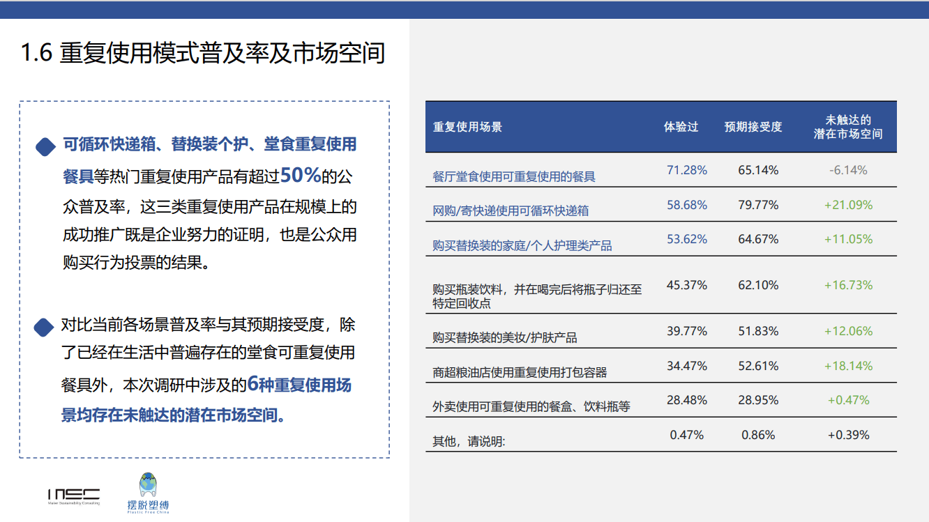 通过对现有普及度和预期接受度进行对比,报告发现在目前的体验过的普及度和大家预期的接受度人群之间尚存差距。该差距代表重复使用未触达的潜在市场空间,也就是态度上接受重复使用,但尚未在现实中购买和体验过该类产品的人群,这个人群目前阶段可以被重点争取的人群。例如网购的循环快递箱,预计接受度为接近80%,尚存在21% 左右的市场差距。在经过更多的消费者的体验之后,重复使用将会获得更多的市场反馈和未来发展潜力。