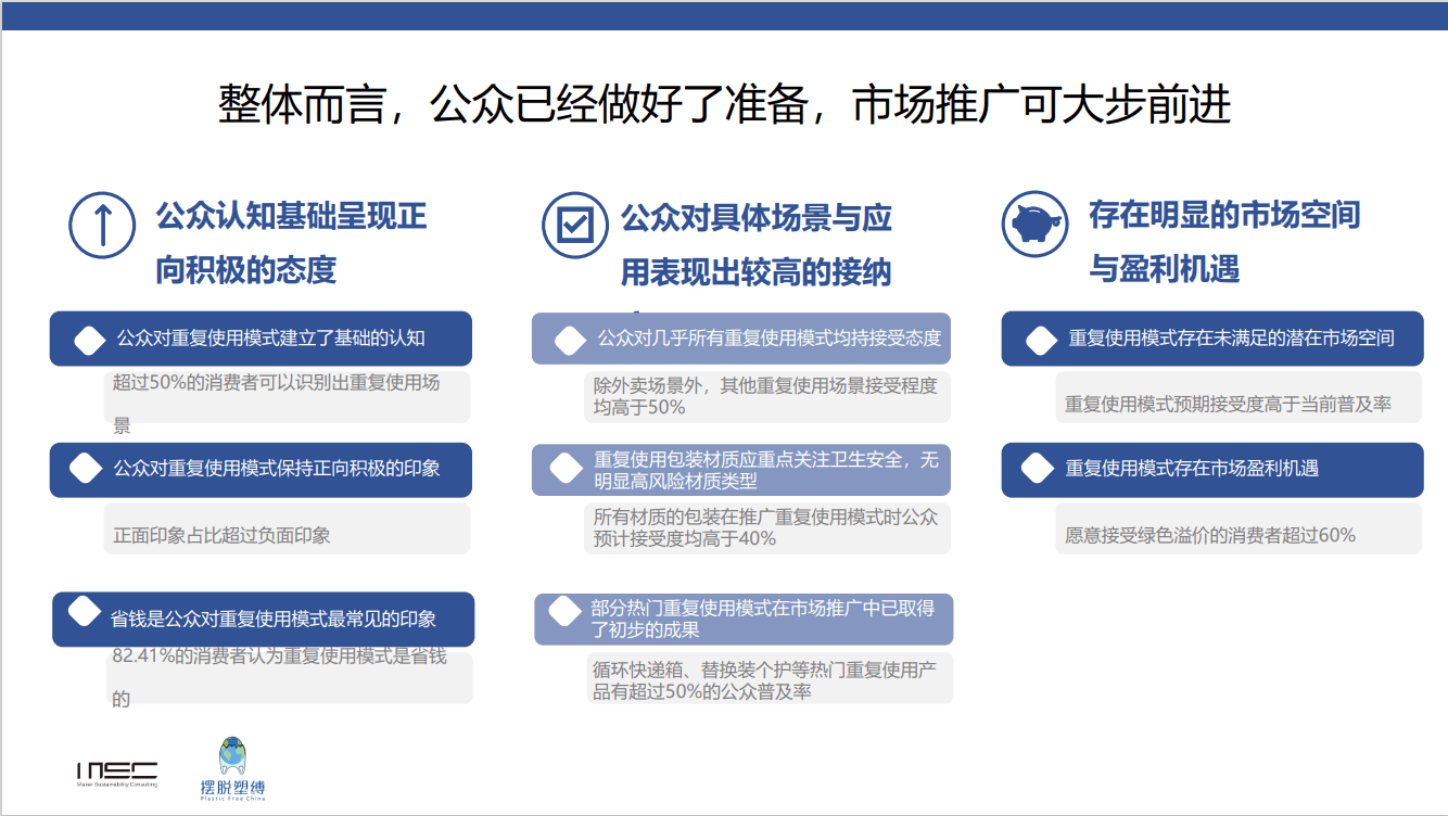 根据整体数据,报告认为虽然当前重复使用模式在中国处于初步发展的阶段,但是公众的认知和消费情绪已经做好了基本准备。基于此,报告撰写者期待有更多企业参与到重复使用的相关创新过程当中,更加积极和主动地进行市场推进相关工作。