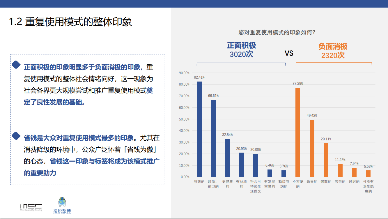 报告调研了解到大家对于重复使用模式的情绪和印象,分别使用正向、负向的关键词,发现选取正面积极关键词的次数约为选取负面关键词的 1.5 倍。其中公众印象最深的是“省钱”这一关键词。虽然它并非代表环保绿色的印象,但足见在当今消费降级的环境里,很多年轻人会怀着以省钱为傲的心态进行消费,“省钱”这一标签和印象将成为重复使用模式的重要推广助力。