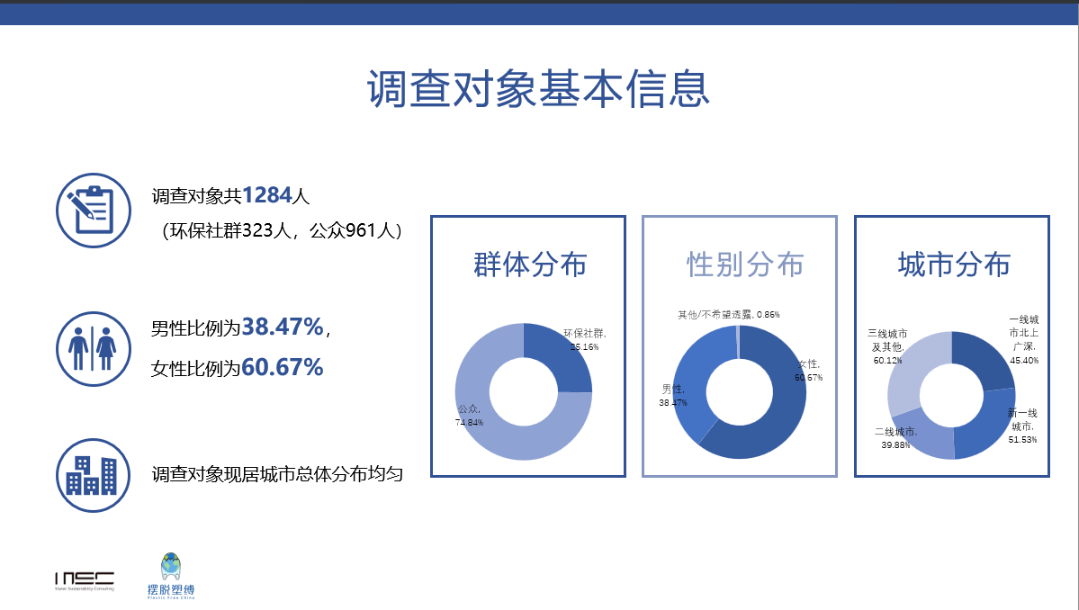 调研累计收到 1284 份问卷,其中来自环保社群的有323 份,普通公众961 份。调研对象中男性占38.47%,整体性别比相对平衡。调查对象在一线、新一线城市、二线城市等都有分布。