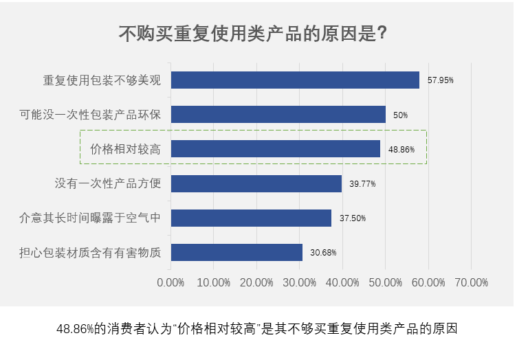 产品便利性并非较为突出的阻碍因素。与预期不同的是,虽然有 39.77% 的人群认为产品的便利性是其阻碍因素,但相比其他因素并不突出。(注:这一数据可能由于重复使用产品的推广范围较小,公众对便利性还未开始重视,未来这一数据需要持续关注)