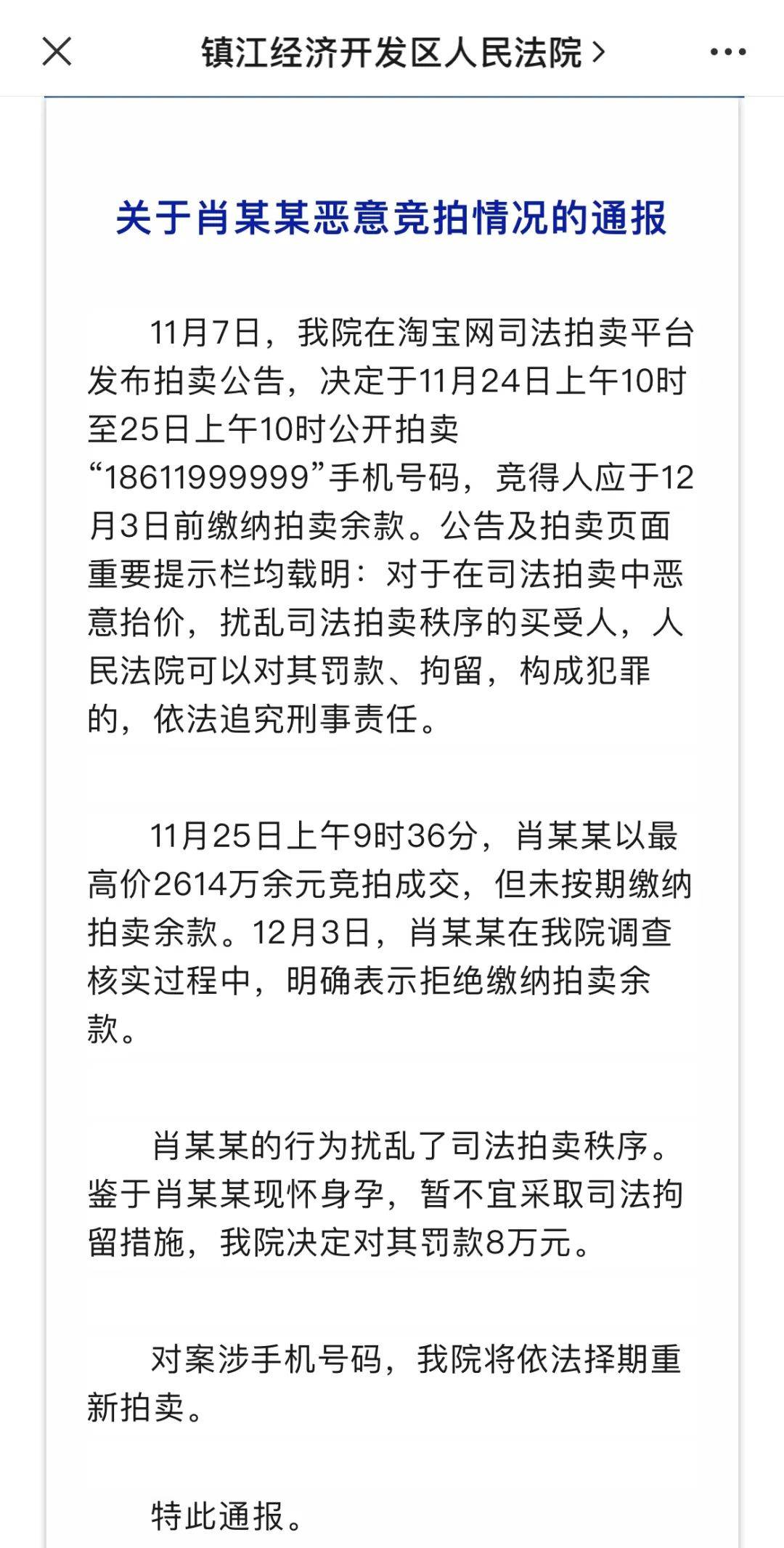 12月3日,肖某某在该院调查核实过程中,明确表示拒绝缴纳拍卖余款。肖某某的行为扰乱了司法拍卖秩序。 鉴于肖某某现怀有身孕,暂不宜采取司法拘留措施,该院决定对其罚款8万元。对案涉手机号码,将依法择期重新拍卖。