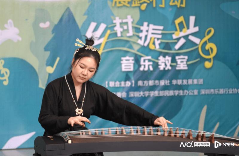 之后,深圳市乐器行业协会的乐手曾思豪通过电吹管,向孩子们展示了不同乐器的音色魅力,协会理事、古筝教育工作者尹惠雯用古筝奏响《彝族舞曲》,释放出中国传统民族乐器的魅力。