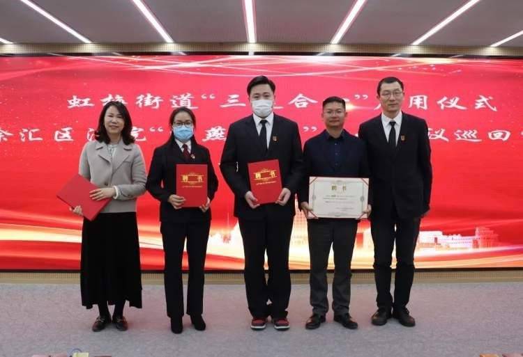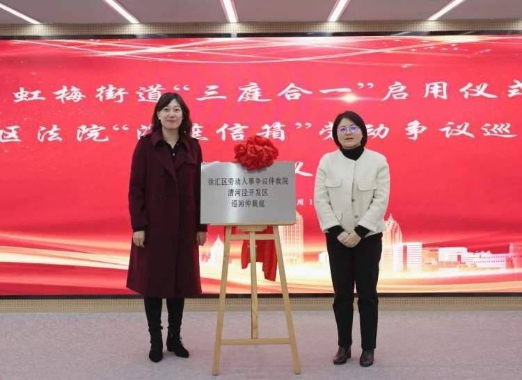 “漕河泾开发区联合调解中心虹梅调解庭”“徐汇区劳动人事争议仲裁院漕河泾开发区巡回仲裁庭”“徐汇区法院‘甘棠树下’社区法官工作室‘海燕信箱’劳动争议巡回审判站”相继在现场揭牌。新任职的仲裁员和调解员在仪式上领取了聘用证书,为虹梅街道的法治团队增添了新力量。