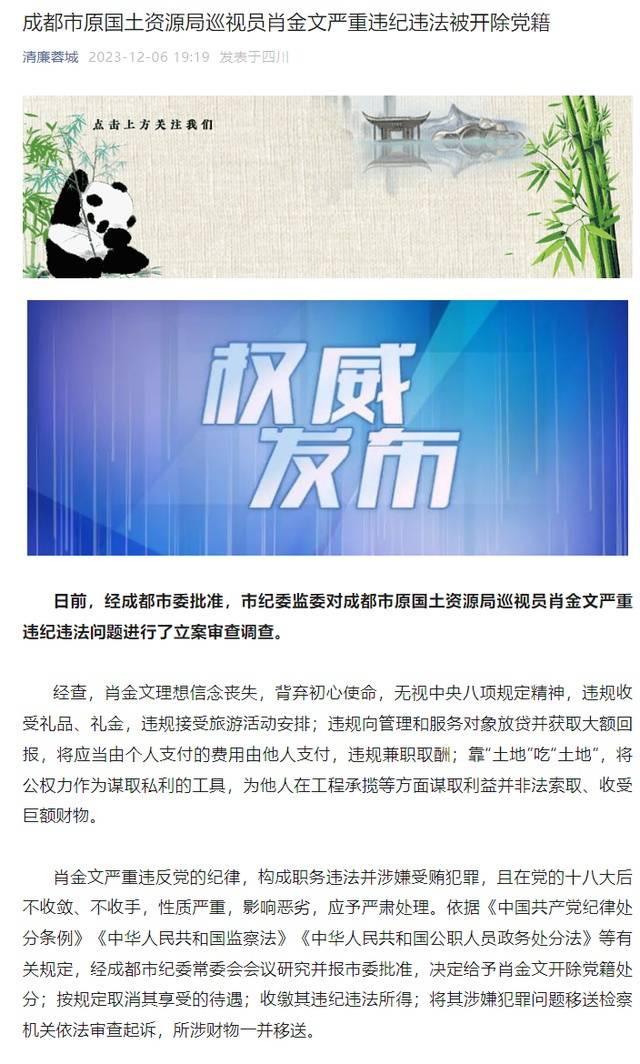 日前,经成都市委批准,市纪委监委对成都市原国土资源局巡视员肖金文严重违纪违法问题进行了立案审查调查。