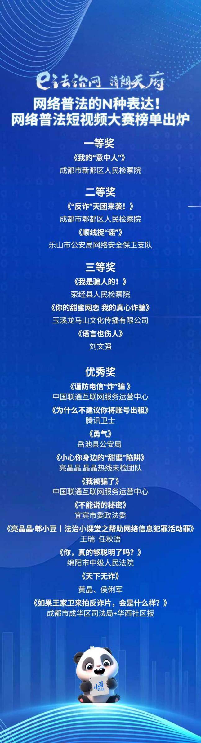 近日,由四川省委网信办、四川省司法厅主办,封面新闻承办,平安集团支持的“e法治网 清朗天府”网络普法短视频大赛在经过激励角逐,仔细筛选后,评选结果正式“出炉”。