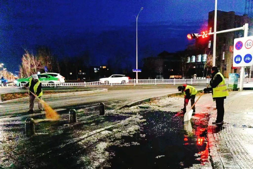 当天雨停后,环卫服务中心协调安排洗扫车、吸污车、环卫作业人员,对石河子市天山路、西四路、东四北五路口等主次干道、公交站台进行排水、洗刷,对重点区域用洗扫车多次来回洗扫,对机械作业不到的地方采取人工排水清淤,防止气温下降造成路面结冰。